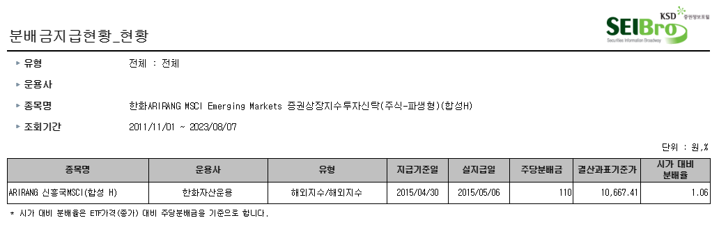실지급일 조회를 해보니 년 1회 정도 지급이 되었고, 몇몇 해에는 지급이 되지 않았음을 확인할 수 있습니다.