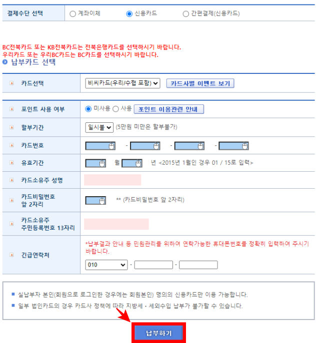 6. 결제수단 선택에서 원하는 결제수단을 선택합니다. 지방세의 경우 신용카드 납부 시 별도의 수수료가 없으니 신용카드를 선택하고 정보를 입력한 뒤, 납부 버튼을 클릭합니다.