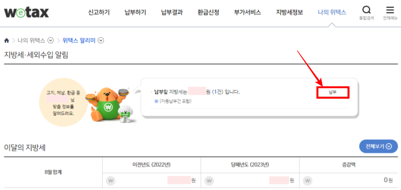 1. 나의 위택스 > 위택스 알리미 납부할 지방세(주민세) 내용을 확인 후 납부 버튼을 클릭합니다.