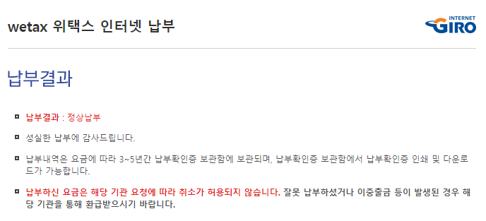 7. 납부가 정상처리되면 납부결과 : 정상납부 메시지를 확인하실 수 있습니다.