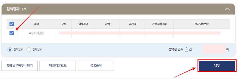 2. 검색결과 아래 납부해야 할 주민세 내용을 확인하고, 좌측의 체크박스를 선택한 뒤 납부 버튼을 클릭합니다.